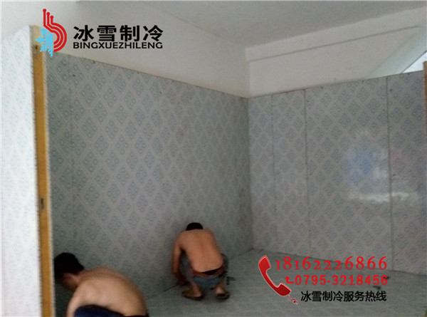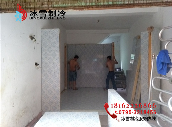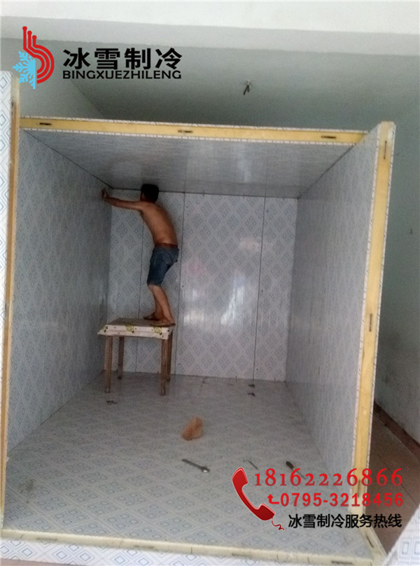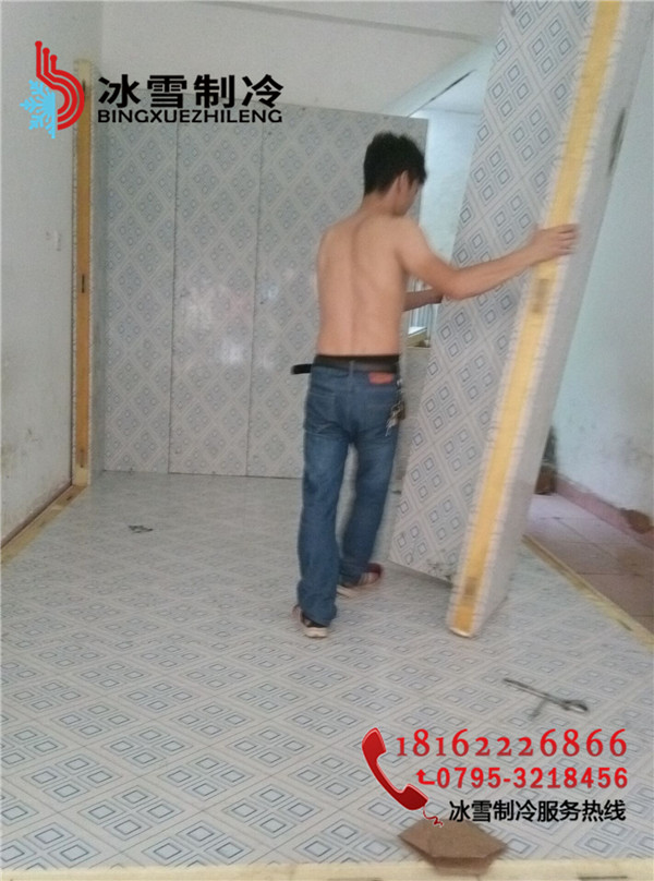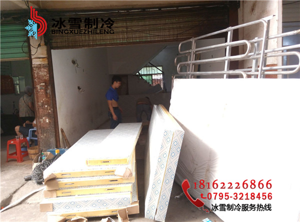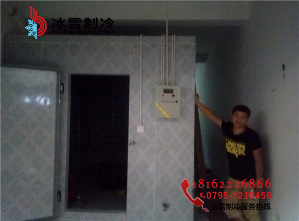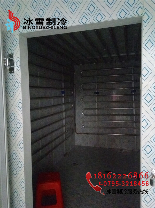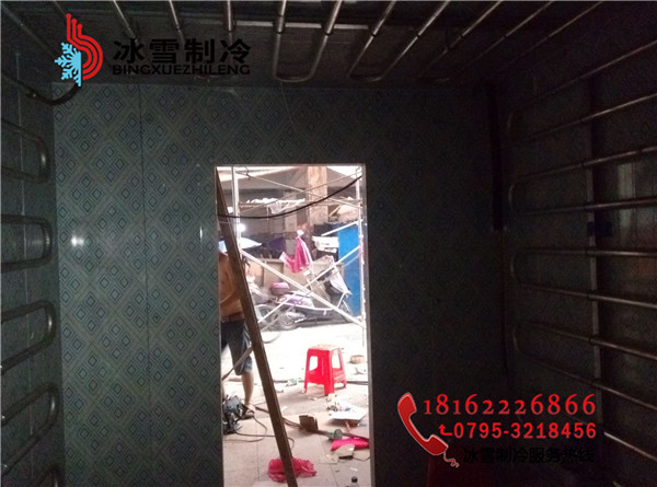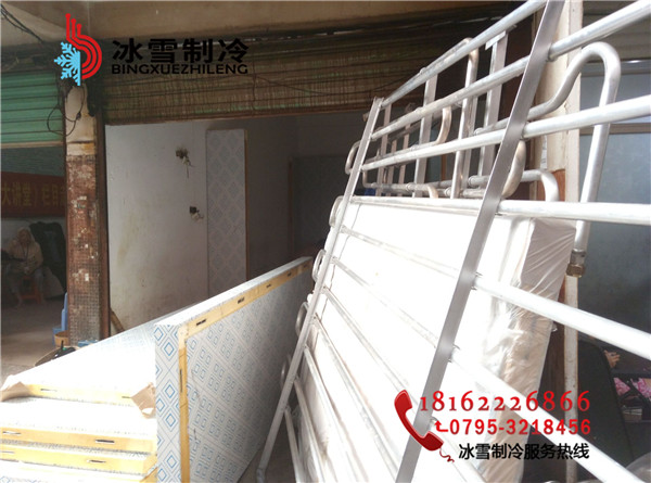 工程地址:分宜菜場凍肉冷庫設計溫度:-20度庫體尺寸:3.3*3.3*2.2庫板規格:雙面彩鋼聚胺脂冷庫板100mm 庫門規格:雙面彩鋼1800*800半埋門溫控箱:單溫智能化箱電控箱制冷方式:翅片鋁排主機:谷輪封閉5匹機組膨脹閥:美國丹佛斯膨脹閥(SPORIAN)Φ15冷庫燈:LED防爆冷庫燈